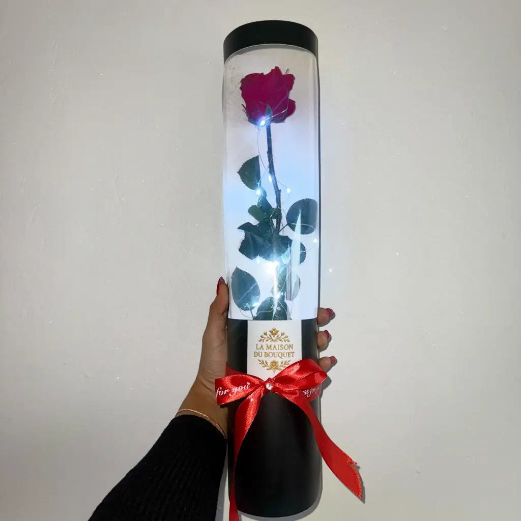 Offrez une touche d'élégance intemporelle avec notre rose éternelle, conservée pour durer 3 ans. Présentée dans une boîte noire avec LED intégrée, elle s'illumine pour sublimer chaque instant.