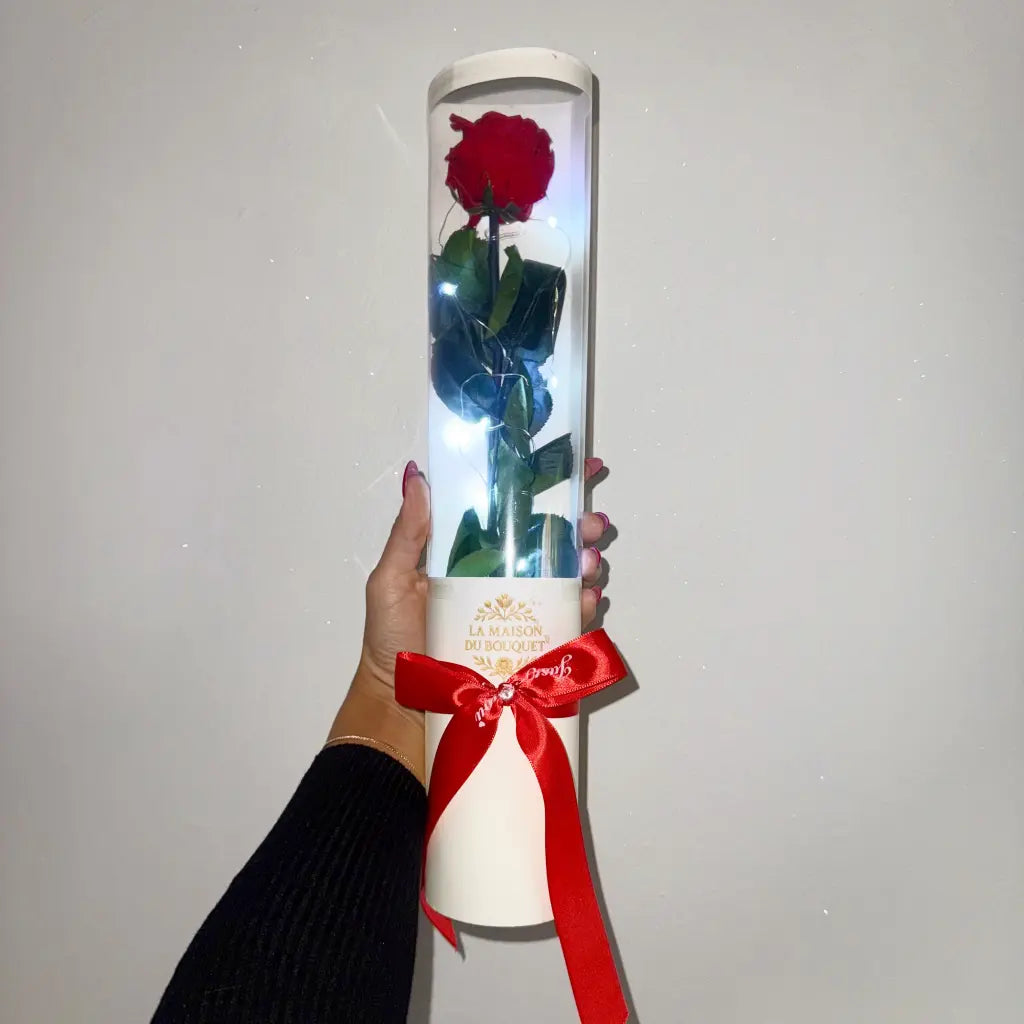 Offrez une touche d'élégance intemporelle avec notre rose éternelle, conservée pour durer 3 ans. Présentée dans une boîte blanche avec LED intégrée, elle s'illumine pour sublimer chaque instant.